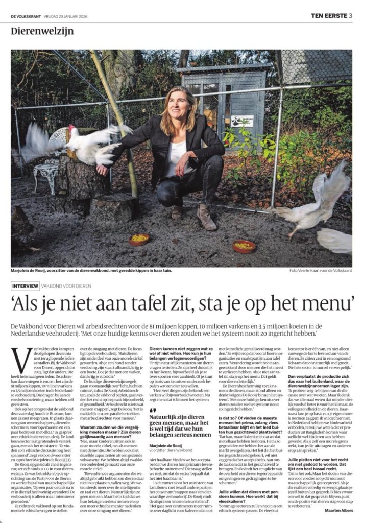 Op Vrijdag 23 januari 2026 sprak Marjolein de Rooij met de Volkskrant over de vakbond, dierenrechten en het komend congres.
