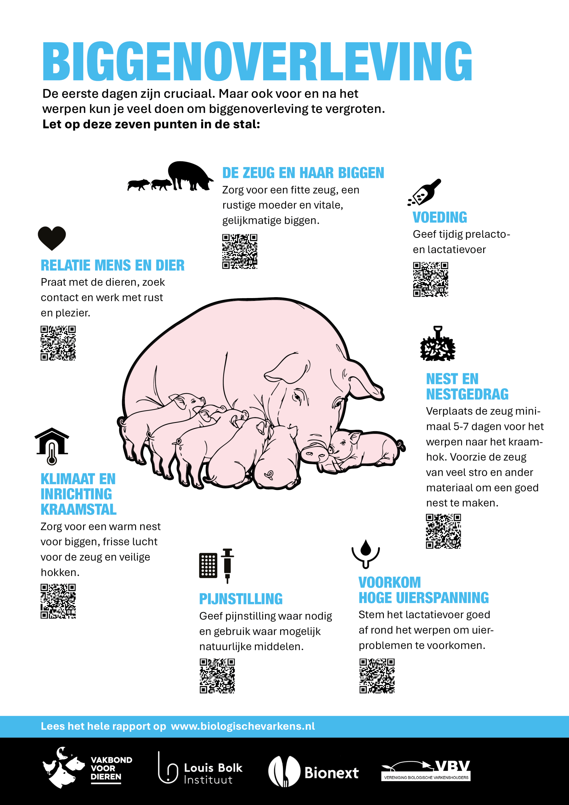 Met het project Biggenoverleving hebben de Vakbond voor Dieren, het Louis Bolk Instituut, BioNext en de Vereniging voor Biologische Varkenshouders kennis uit de praktijk, wetenschap en boerenervaring samengebracht. Doel: inzicht krijgen in de belangrijkste factoren die bijdragen aan gezonde zeugen en vitale biggen.